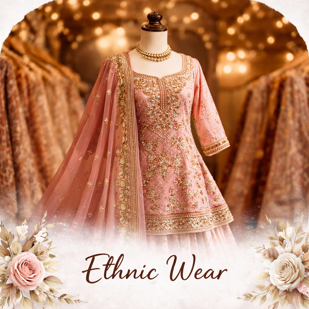 Discover timeless ethnic styles crafted to reflect tradition with a modern touch. From beautifully designed ghararas and suits to elegant festive ensembles, our ethnic collection blends heritage craftsmanship with refined detailing. Perfect for celebrations, gatherings, and special occasions, each piece is thoughtfully curated to enhance grace and confidence.